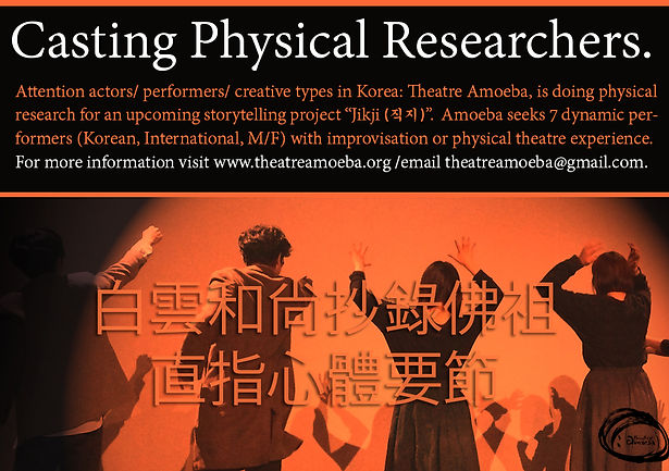 Casting physical researchers. Theatre Amoeba, led by Denise Rinehart, is devising a storytelling project “Jikji”. Amoeba seeks 10 dynamic performers. Visit the Jikji Theatre Project website.